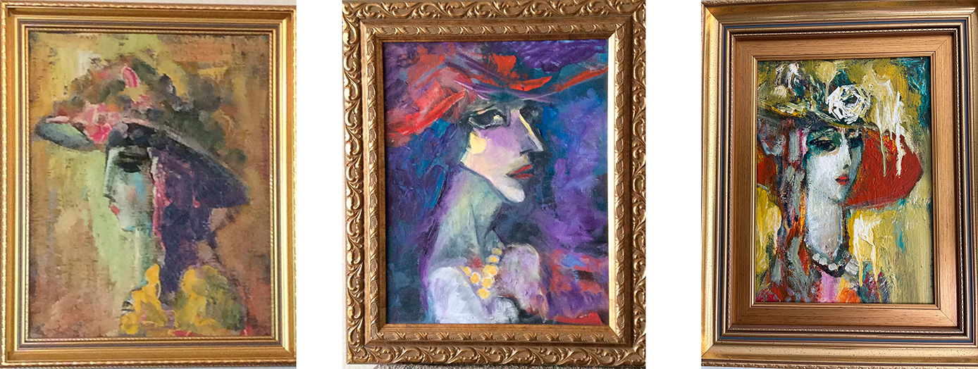 Mystery ladies: not biography, but presence. The hats and flowers function like props in a theatre: they frame the character, amplify mood, and create distance. The partial “unfinished” quality of the faces intensifies mystery — the viewer senses an inner life that is not fully accessible.
