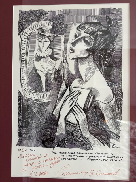 He presented and endorsed for me one of his graphic works—a print from his illustrations of Bulgakov’s Master and Margaritawith a warm personal dedication. And it suddenly made everything click for me: the circus, the masks, the women who “withhold,” the feeling that a portrait is never just a face — it’s a role.