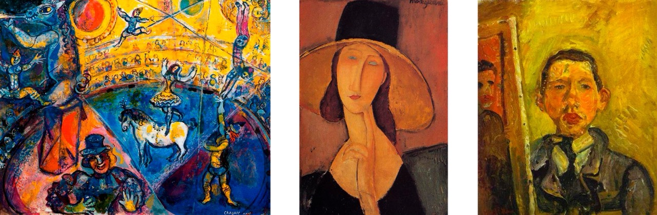 Marc Chagall, 1964, The circus   /                                                                                     Amedeo Modigliani, 1918, “Portrait of Jeanne Hébuterne in a Large Hat”          / Chaim Soutine, 1918,  Self-portrait